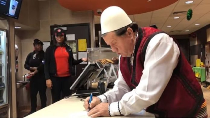 I veshur në veshje kombëtare dhe me plis në kokë, ai ka mësyrë dyqanin e ushqimit të shpejt McDonalds, ku edhe ka pasur një kërkesë mjaft interesante.